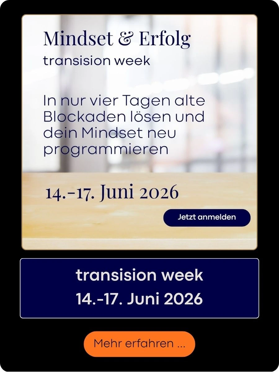 Das Konzept der transision week ist seit 25 Jahren bewährt. Es besteht aus einem Schritt-für-Schritt Prozess, der nachweislich bei 95% der Teilnehmenden Erfolg bringt. Selbstwertsteigerung, Befreiung von Schuldgefühlen und Selbstverurteilung, Auflösung von hartnäckigen Glaubenssätzen und Neuprogrammierung deines Mindsets auf die gewünschte Zukunft.